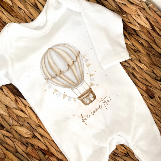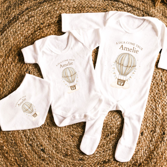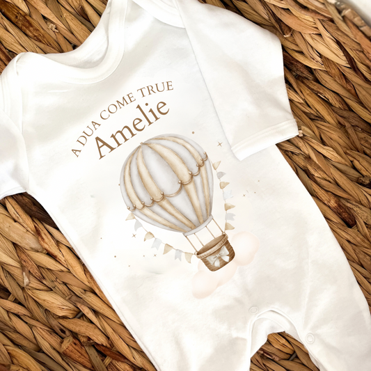 Personalised Muslim New Baby Sleepsuit. A Dua Come True Hot Air Balloon Neutral