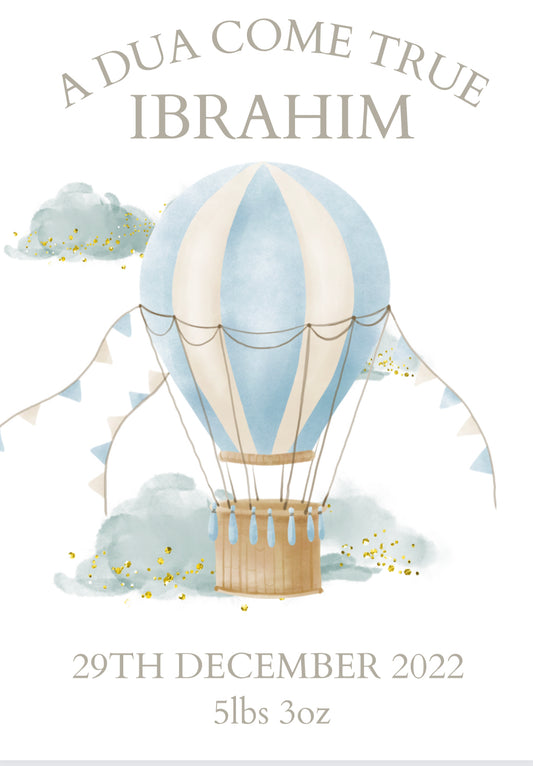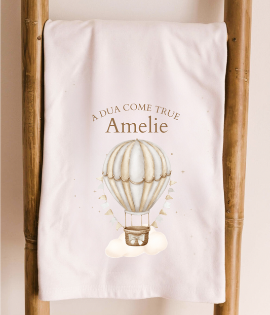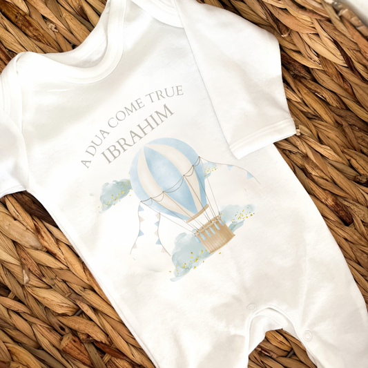 Personalised Muslim New Baby Boy Sleepsuit. A Dua Come True Hot Air Balloon