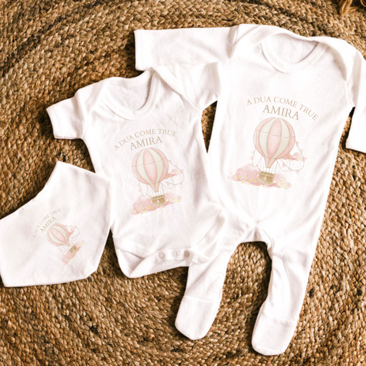Personalised Muslim New Baby Girl Sleepsuit. A Dua Come True Hot Air Balloon