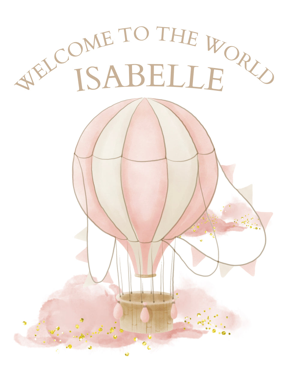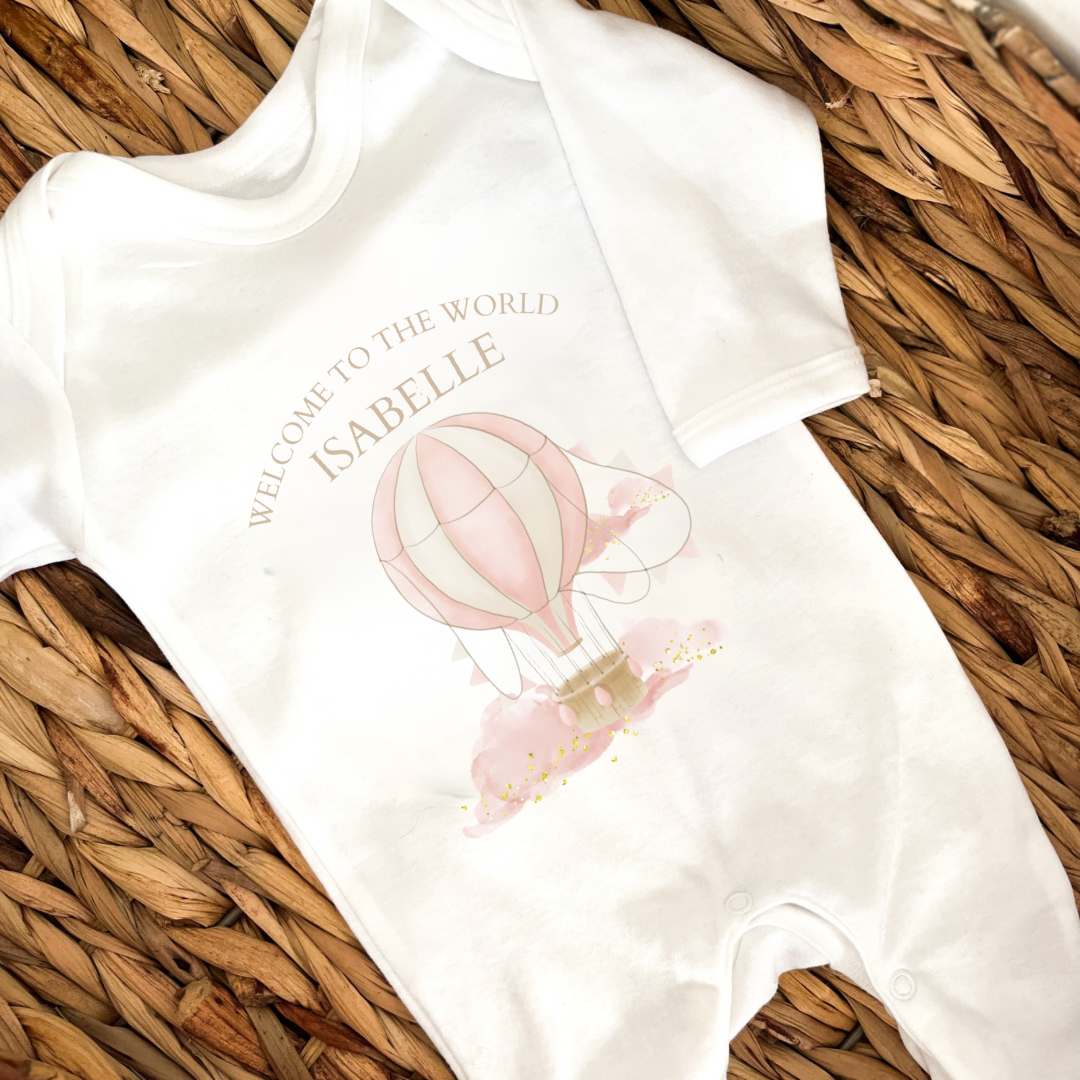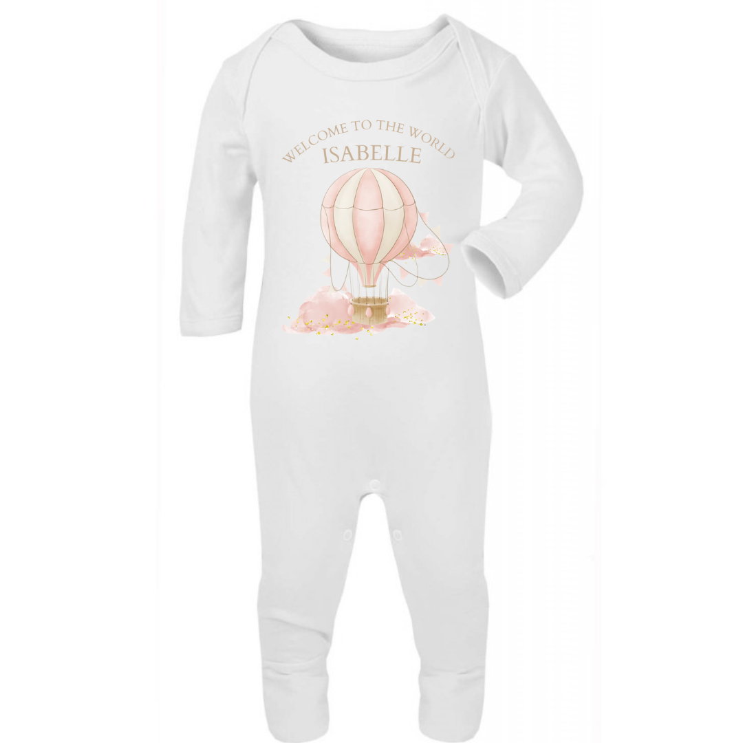 Personalised New Baby Girl Sleepsuit. Welcome to the World Hot Air Balloon