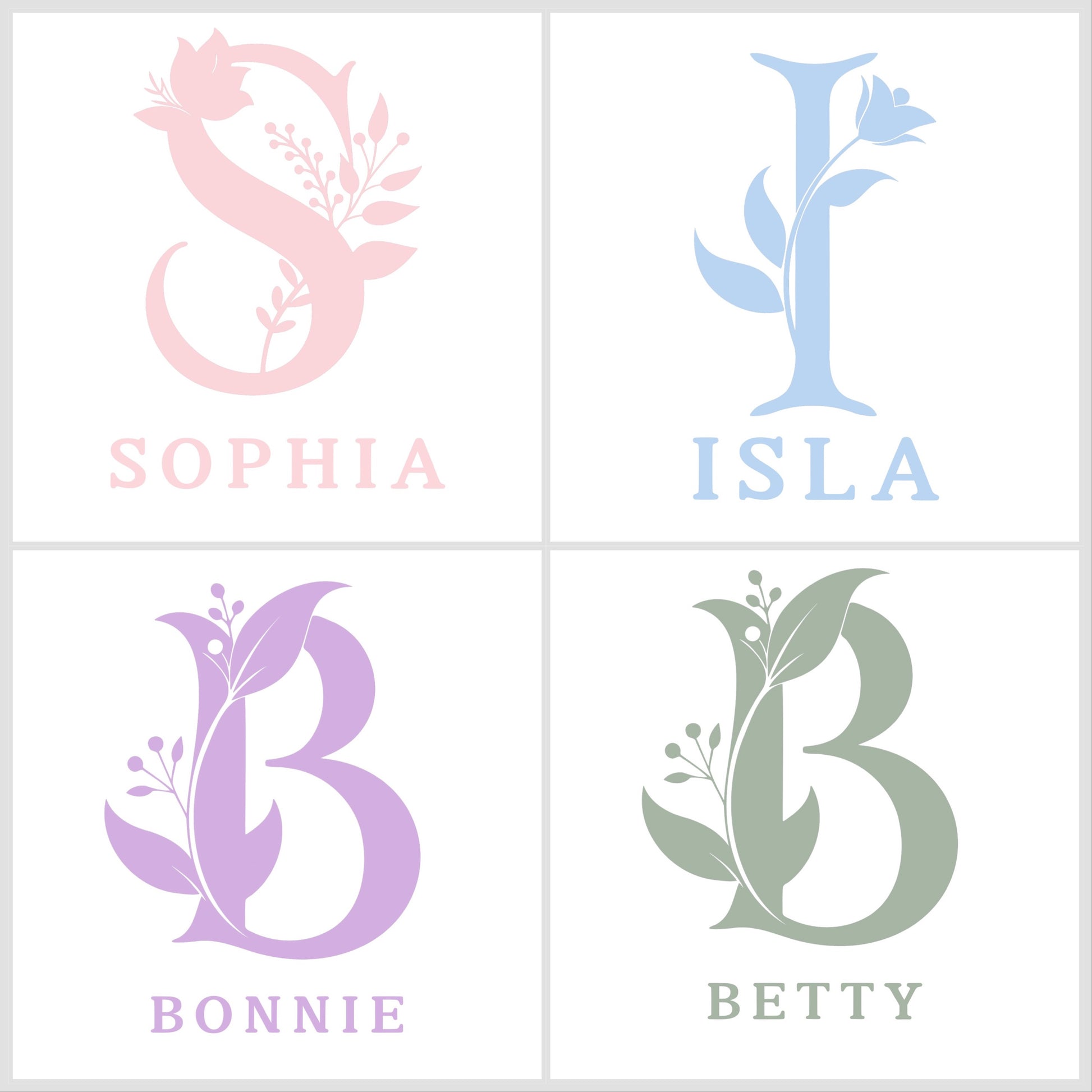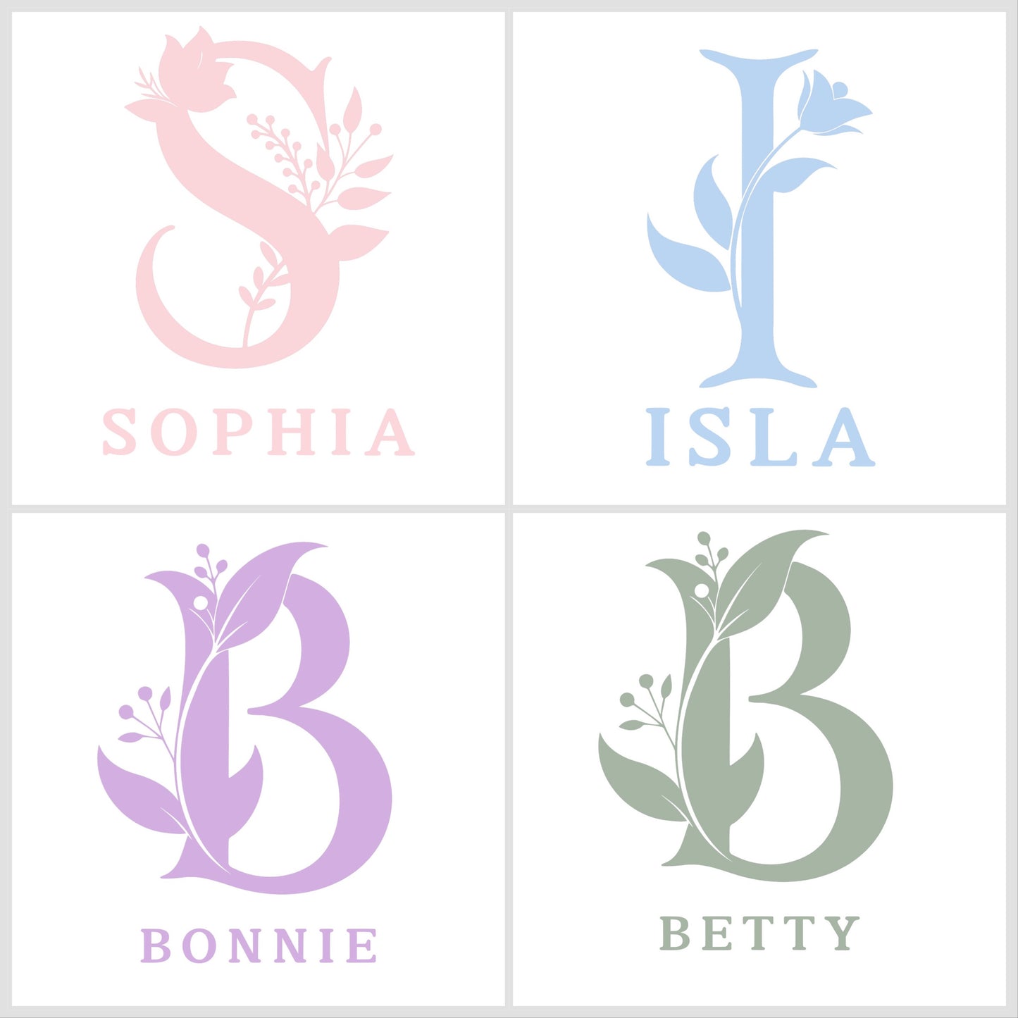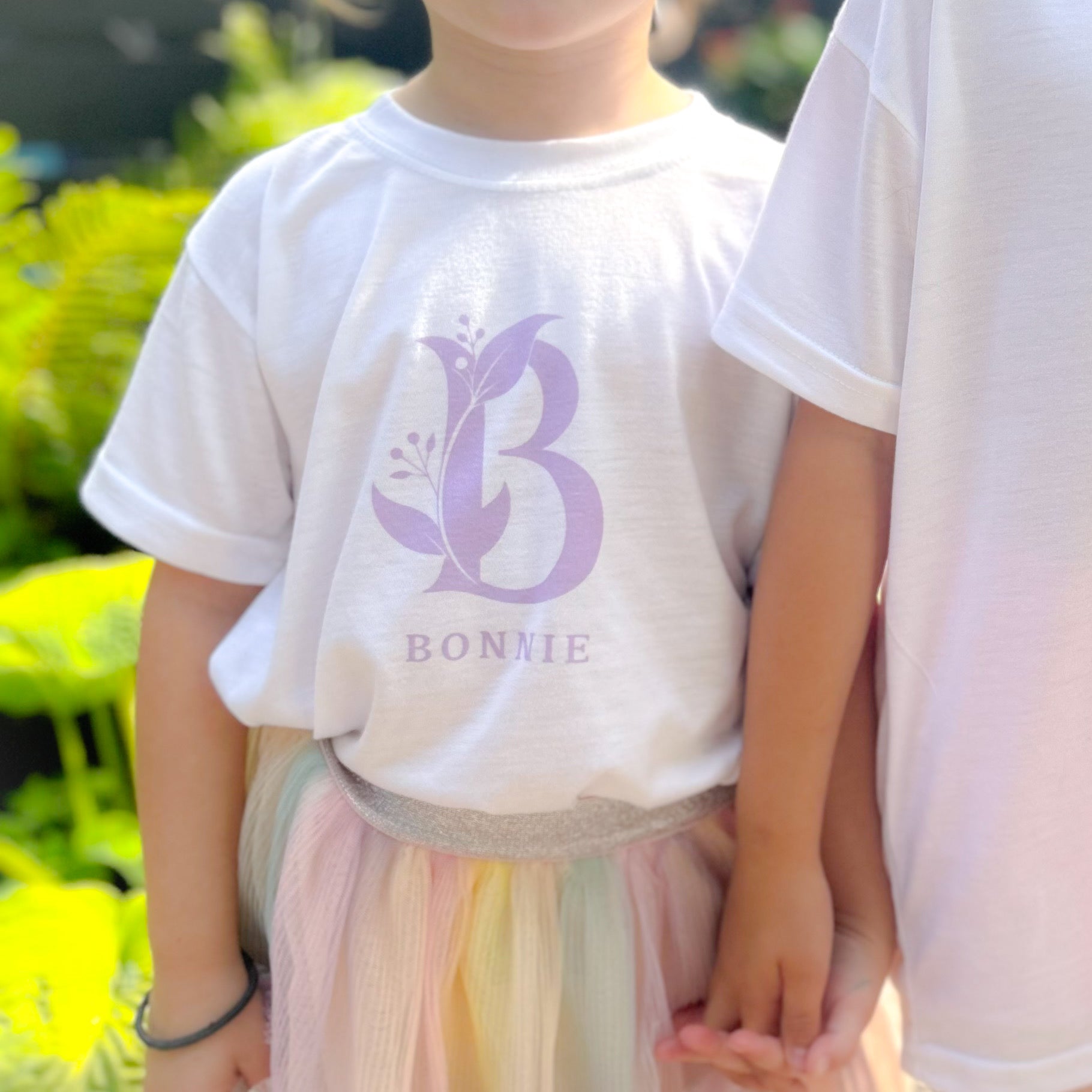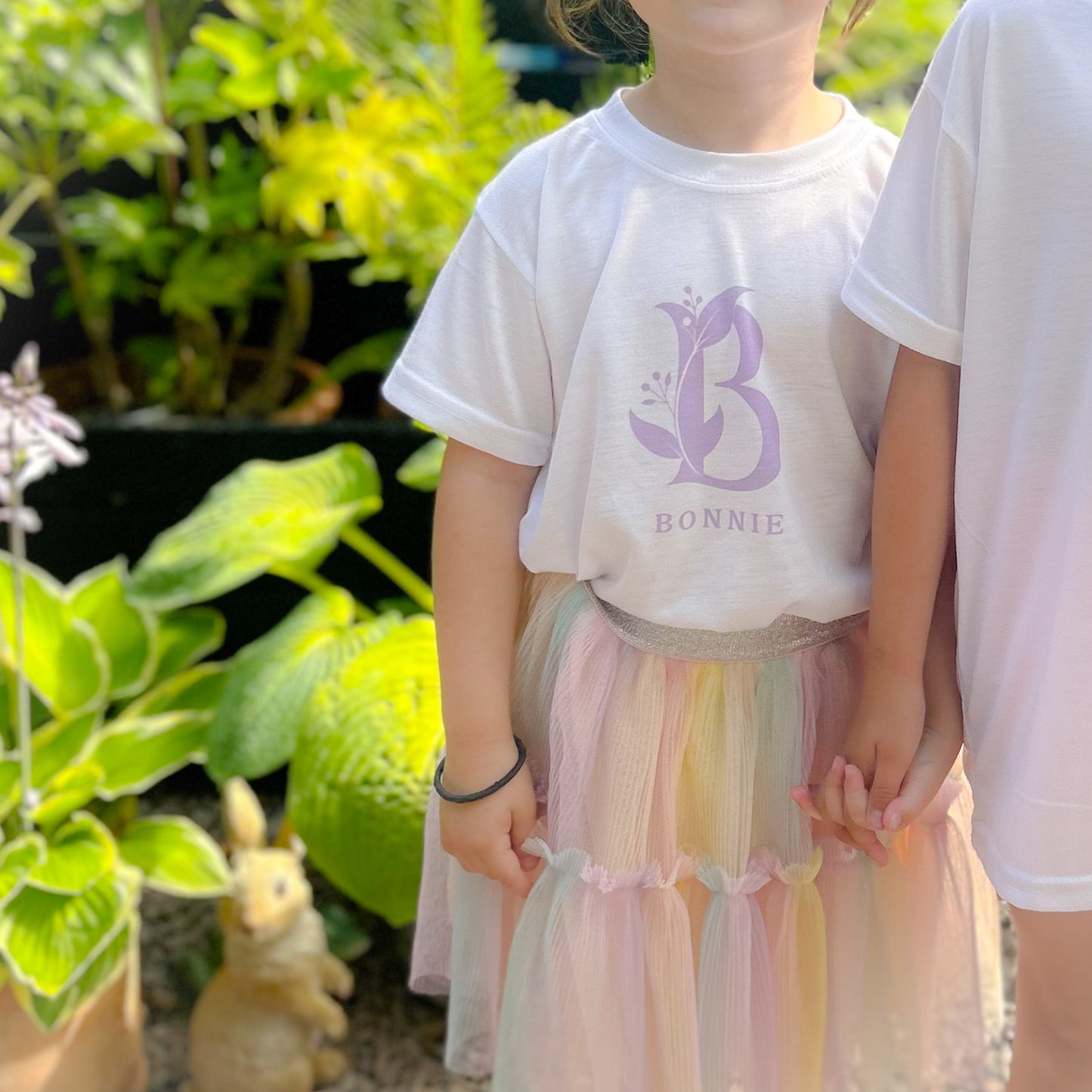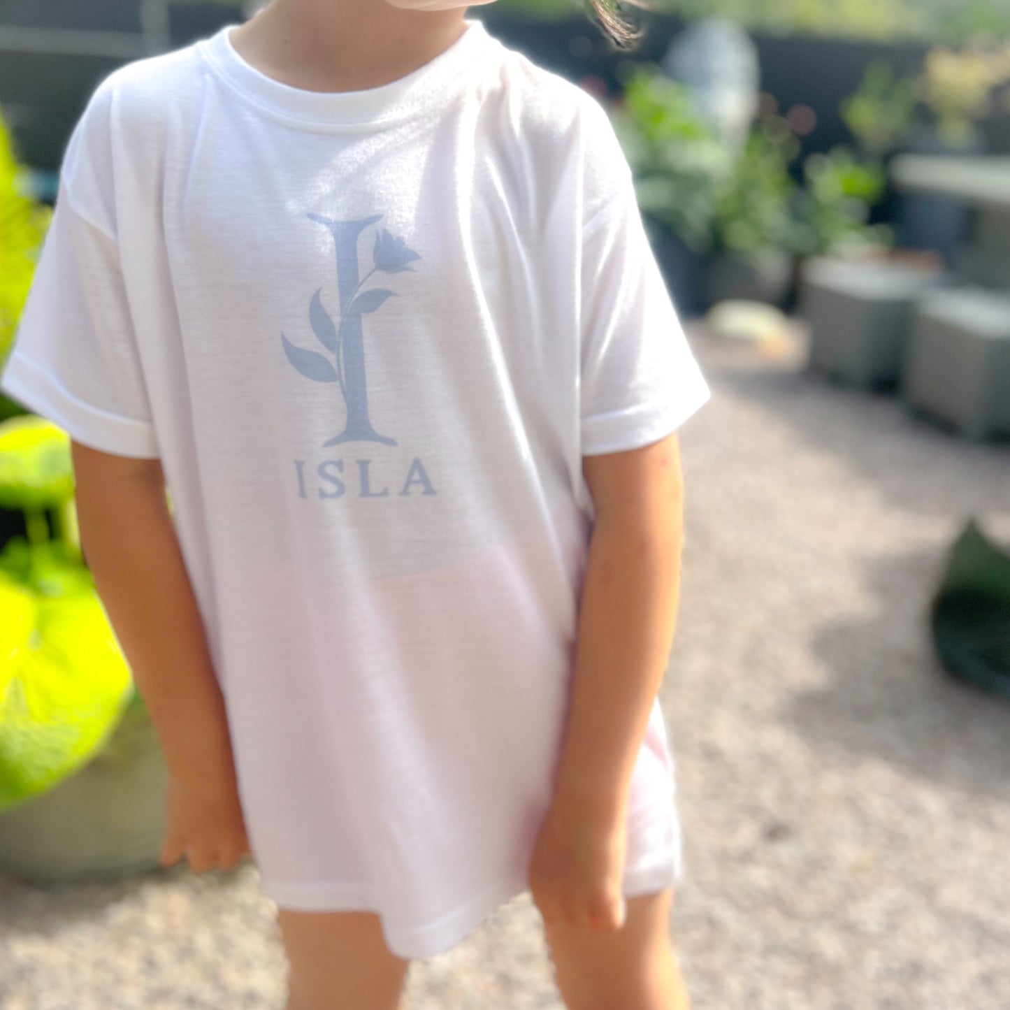 Personalised Children’s T-Shirts with subtle floral initial and name. Available in a selection of beautiful pastel colours.