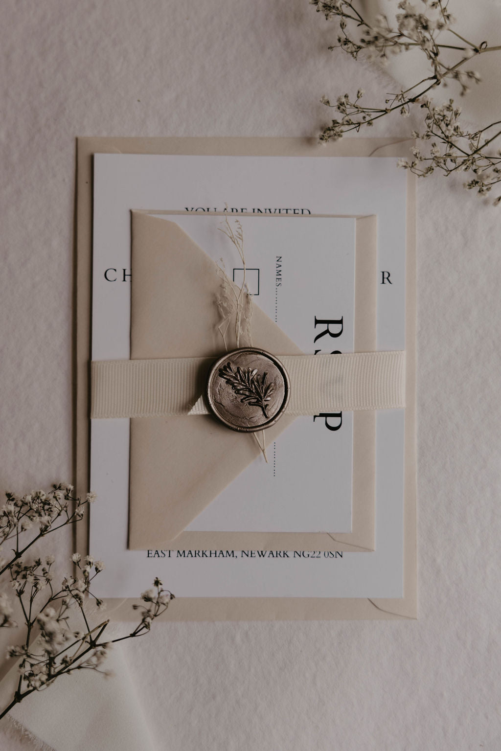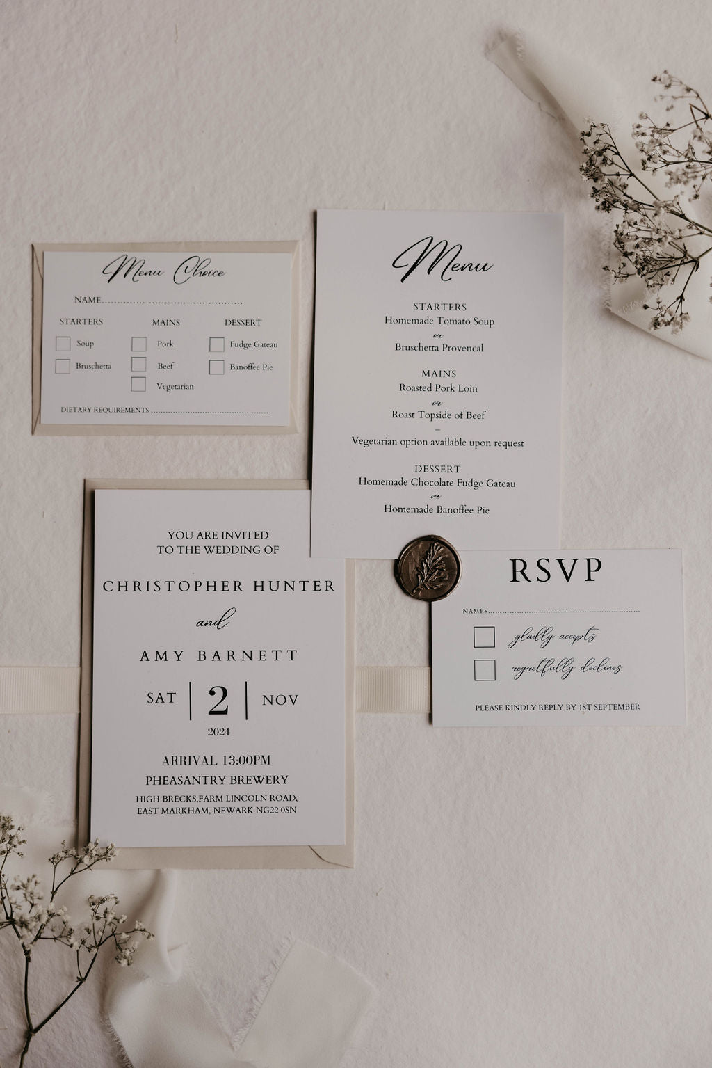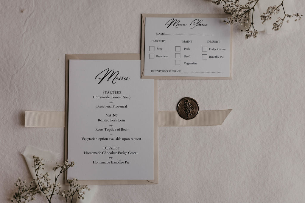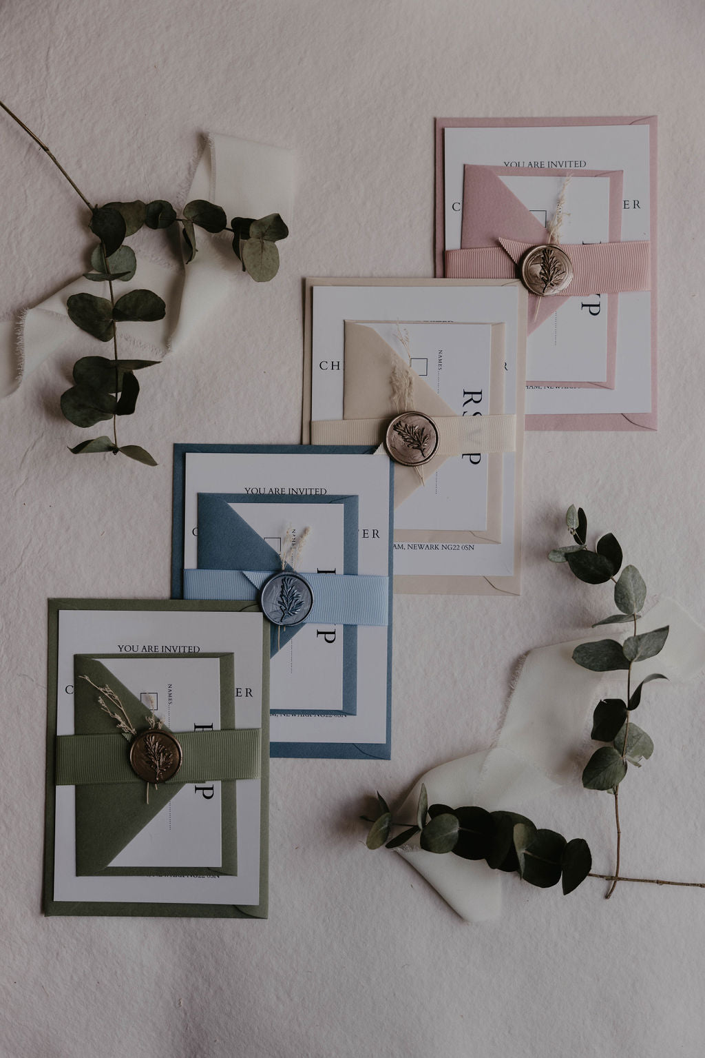 Each invitation is printed on high quality A6 white silk card, finished off with your choice of colour envelope, ribbon, wax seal and dried sprig.