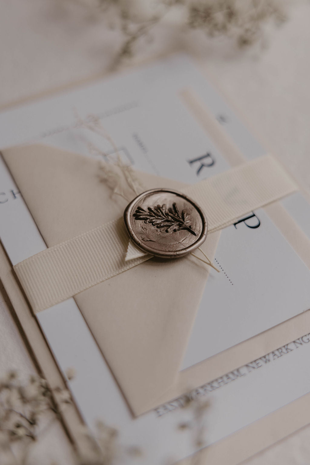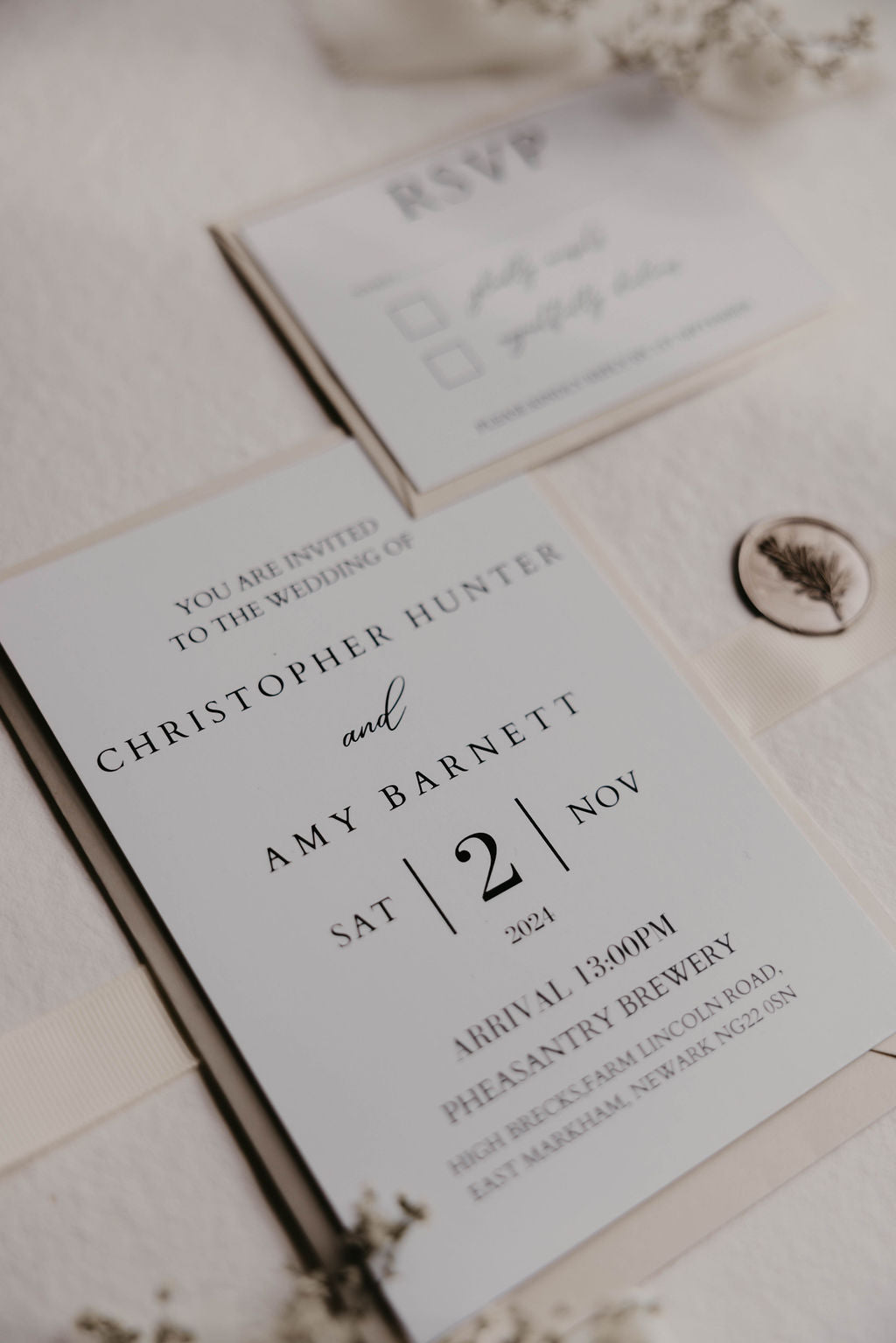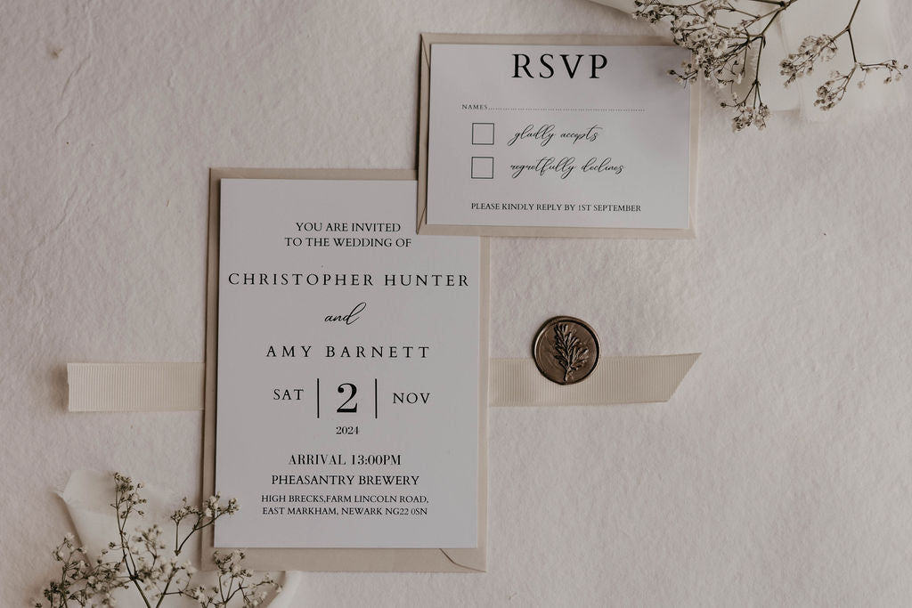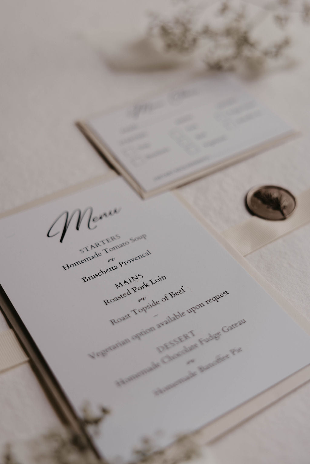 Each invitation is printed on high quality A6 white silk card, finished off with your choice of colour envelope, ribbon, wax seal and dried sprig.