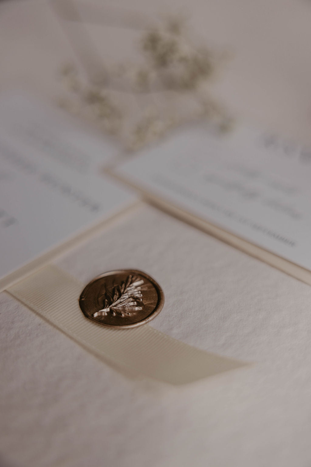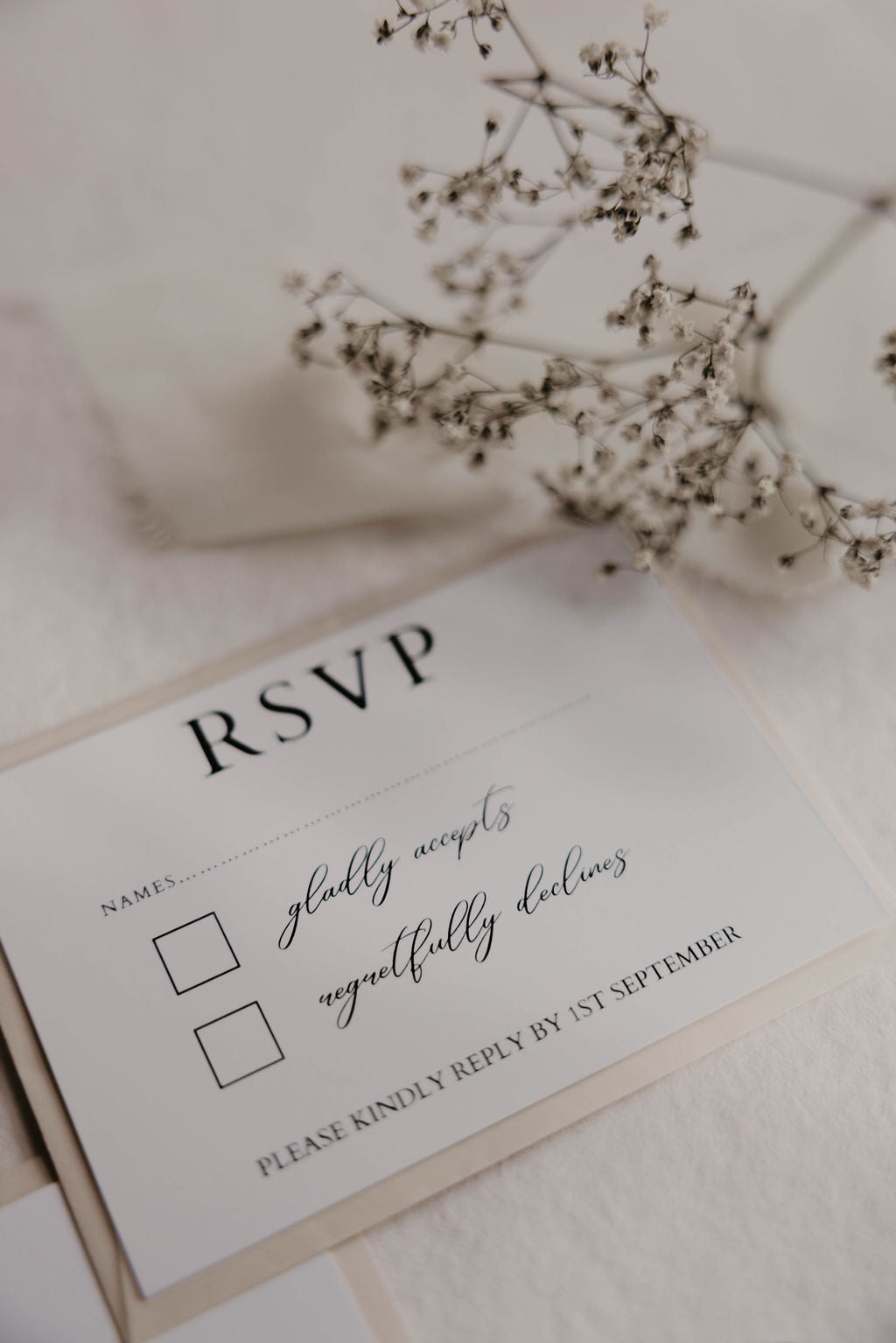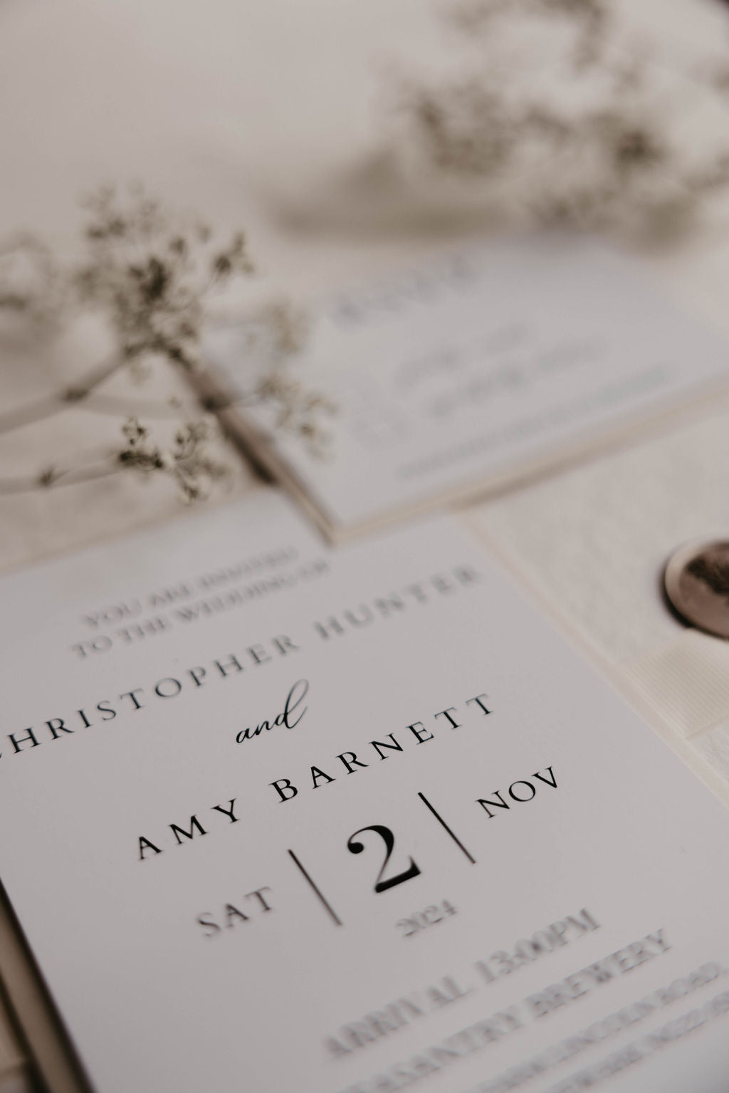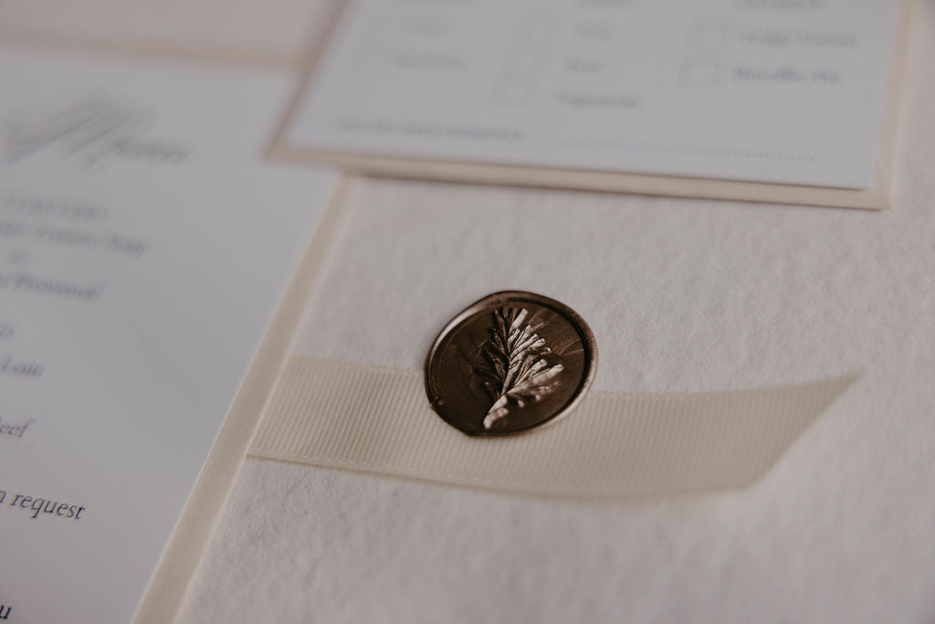 Each invitation is printed on high quality A6 white silk card, finished off with your choice of colour envelope, ribbon, wax seal and dried sprig.