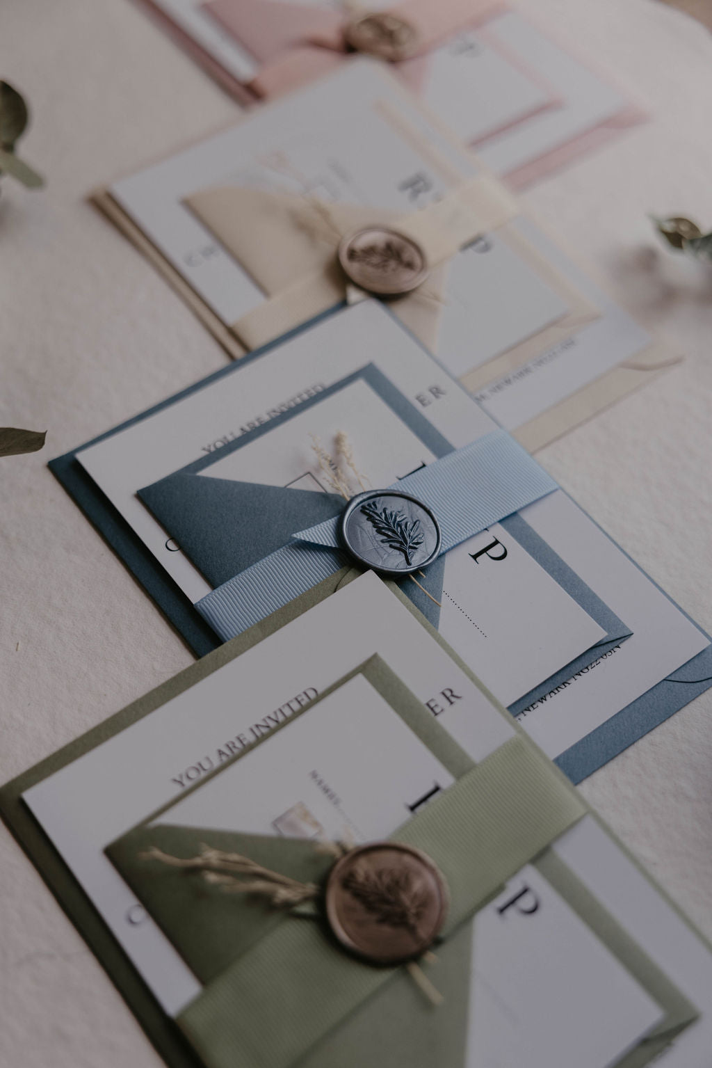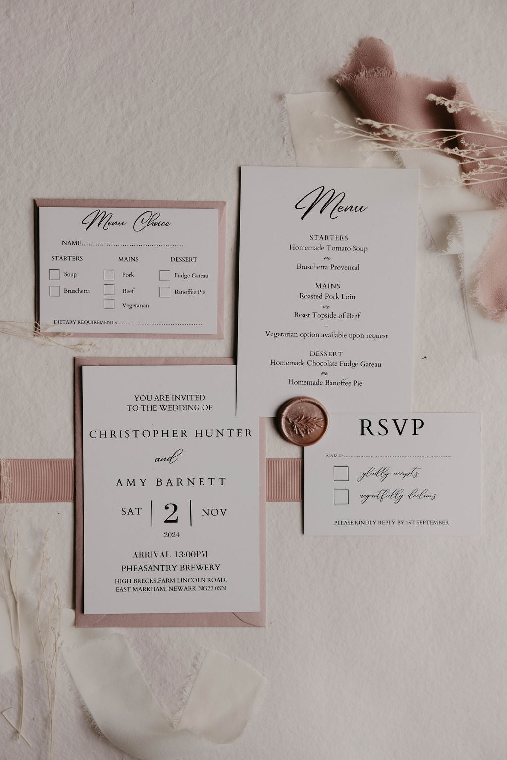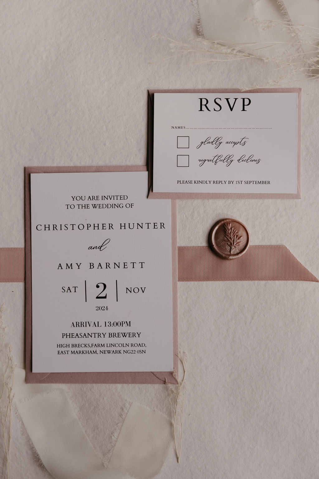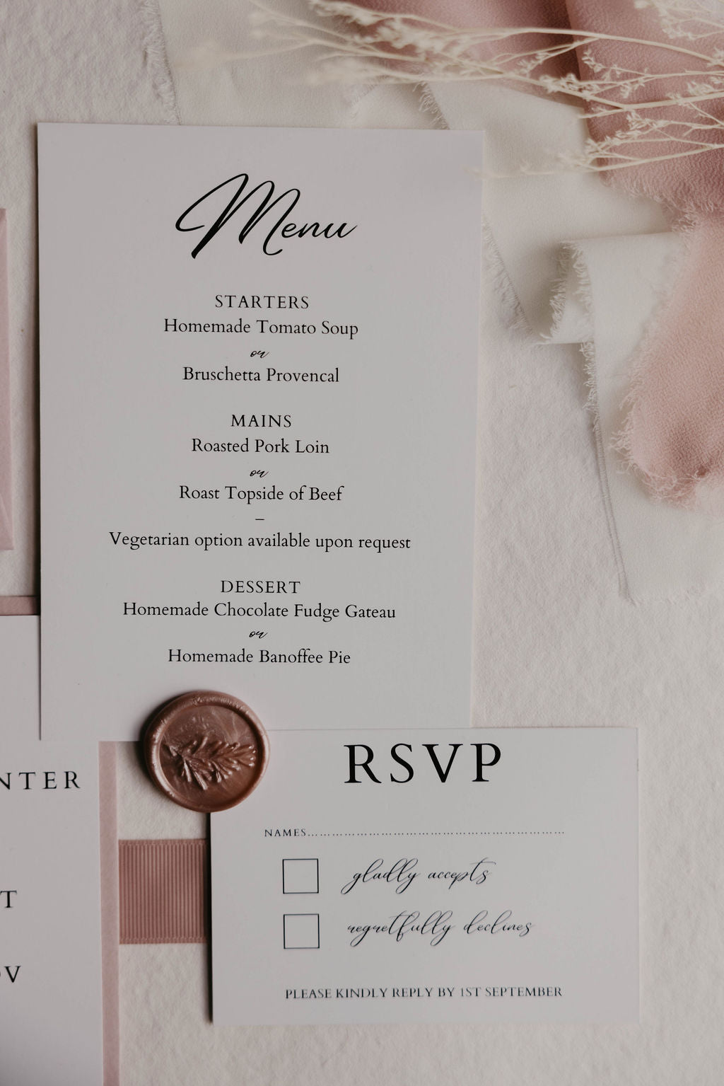 Each invitation is printed on high quality A6 white silk card, finished off with your choice of colour envelope, ribbon, wax seal and dried sprig.
