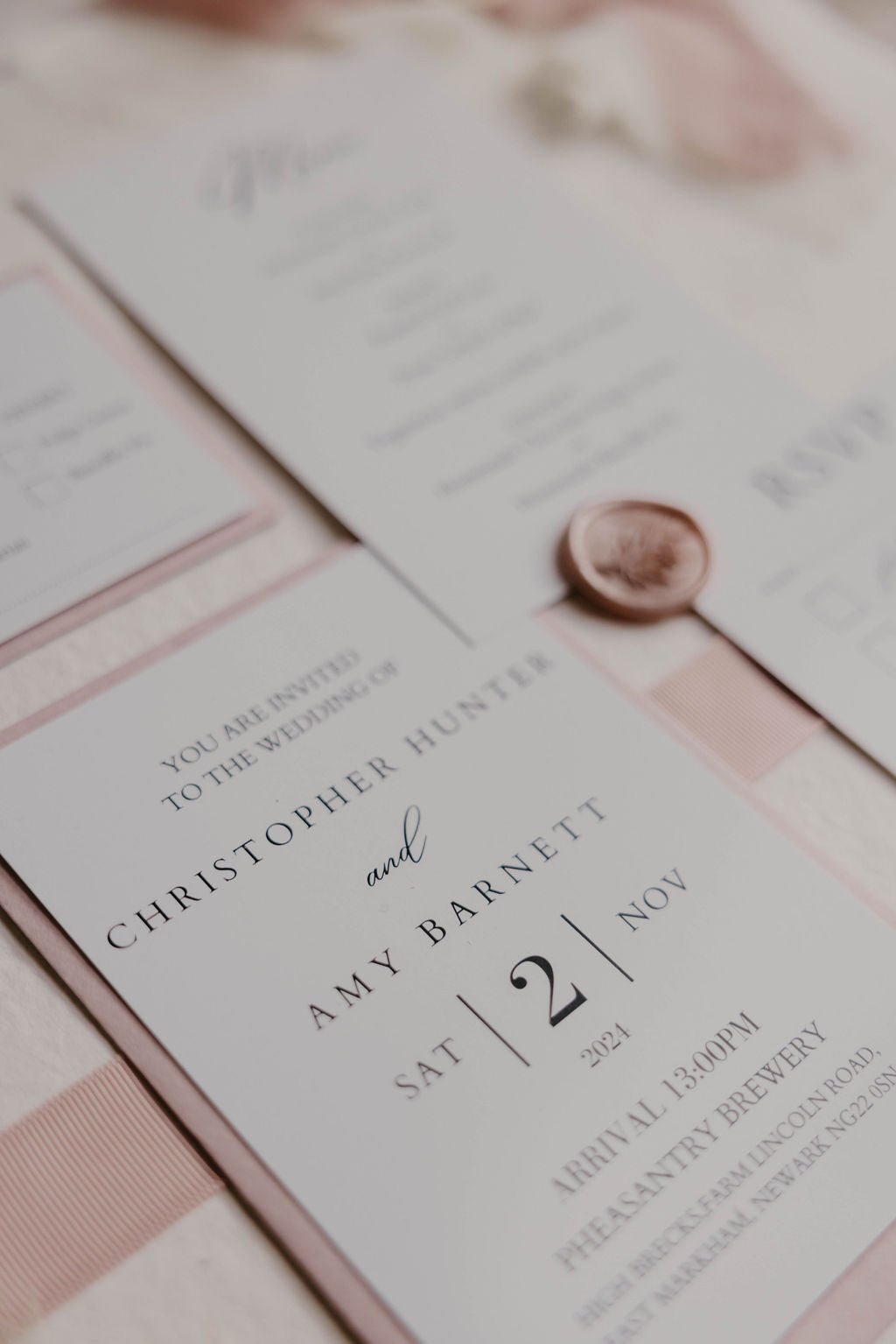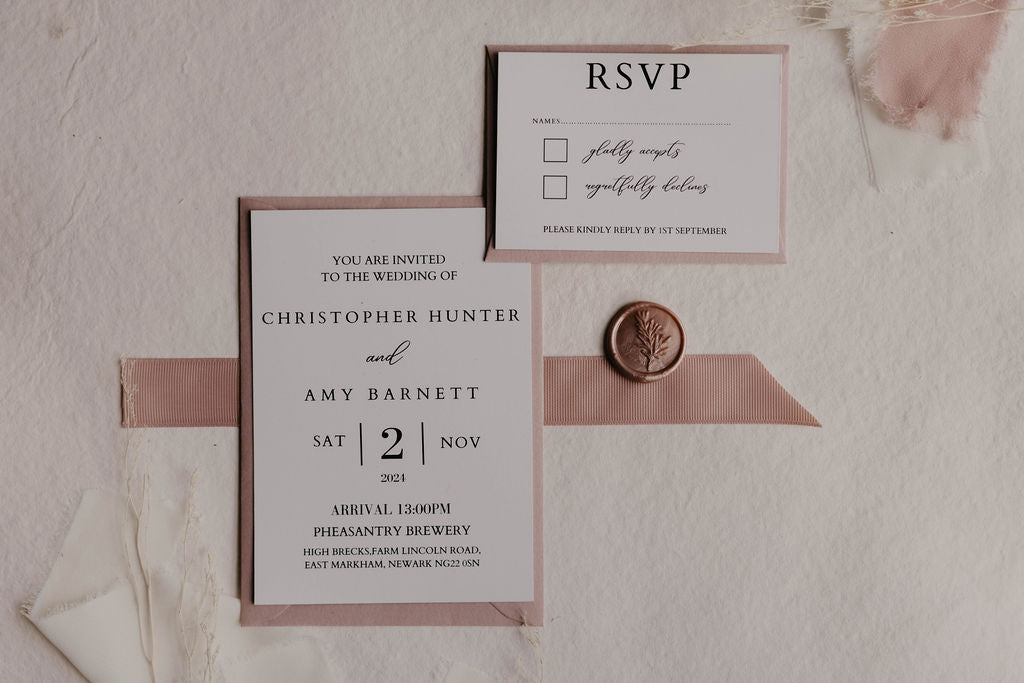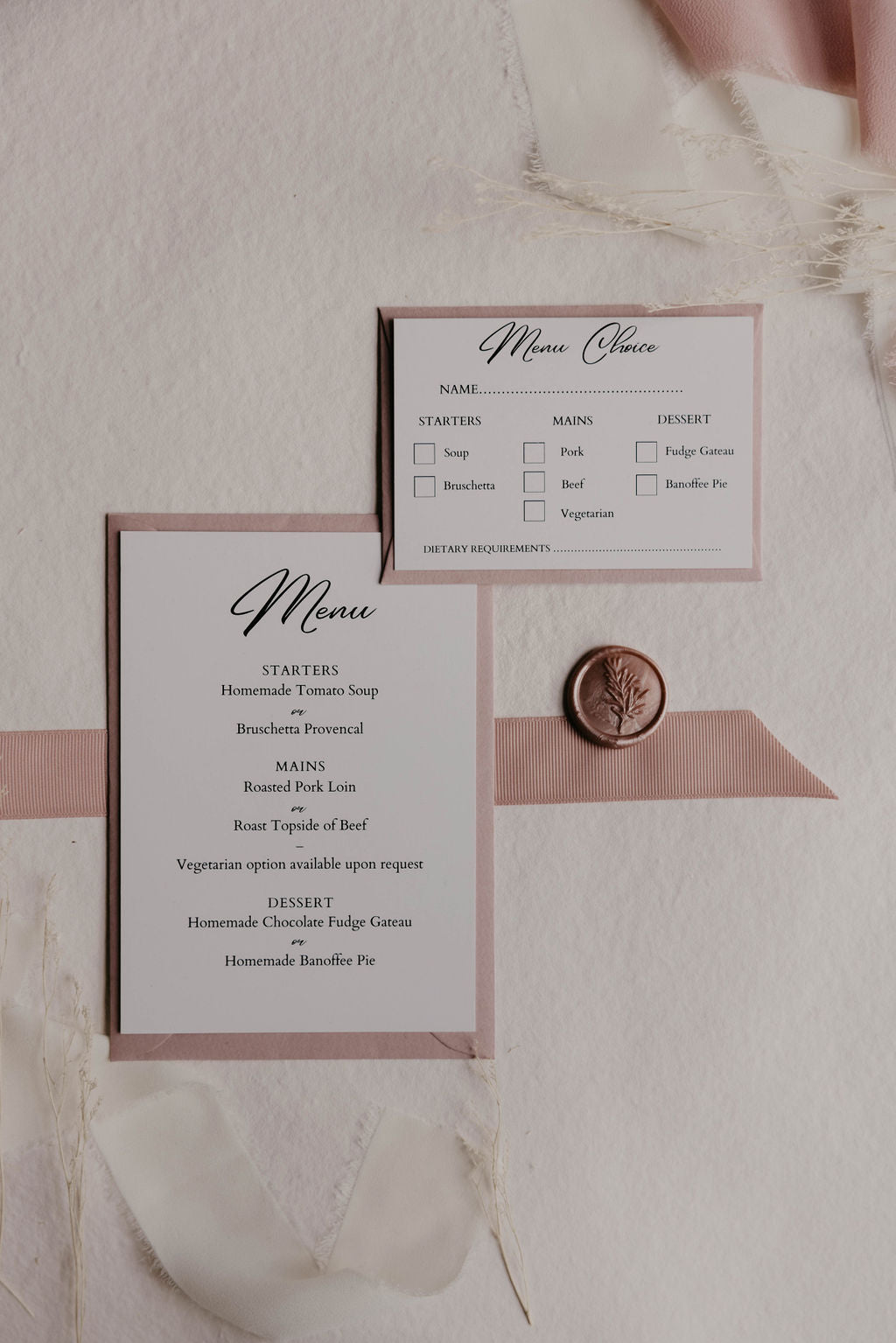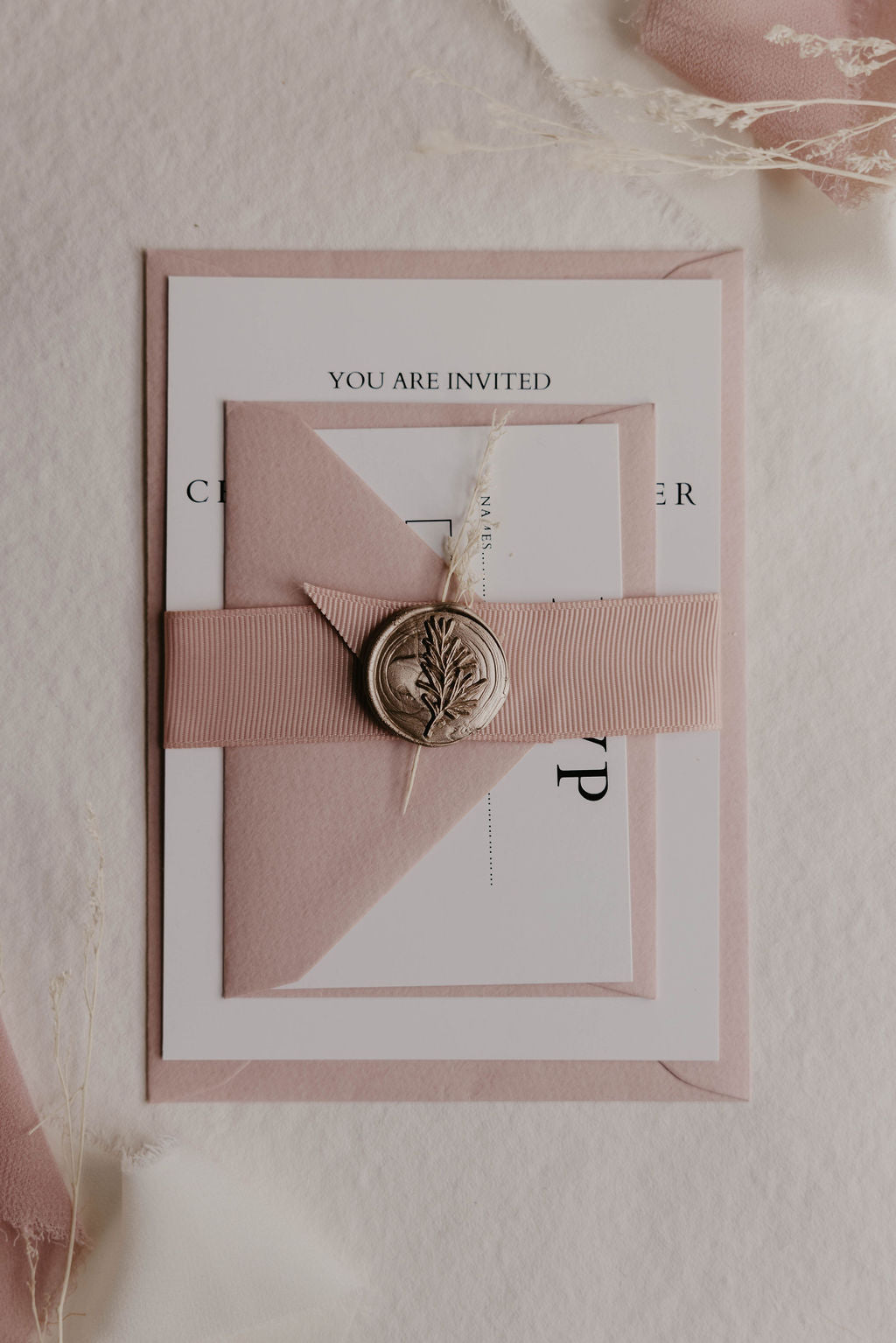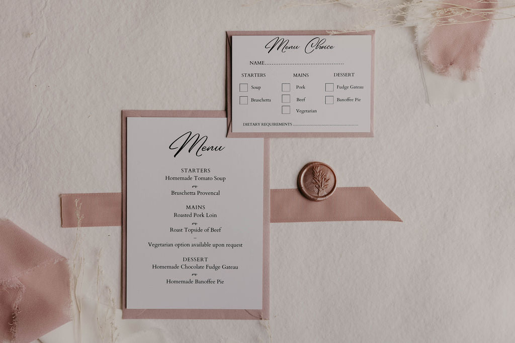 Each invitation is printed on high quality A6 white silk card, finished off with your choice of colour envelope, ribbon, wax seal and dried sprig.
