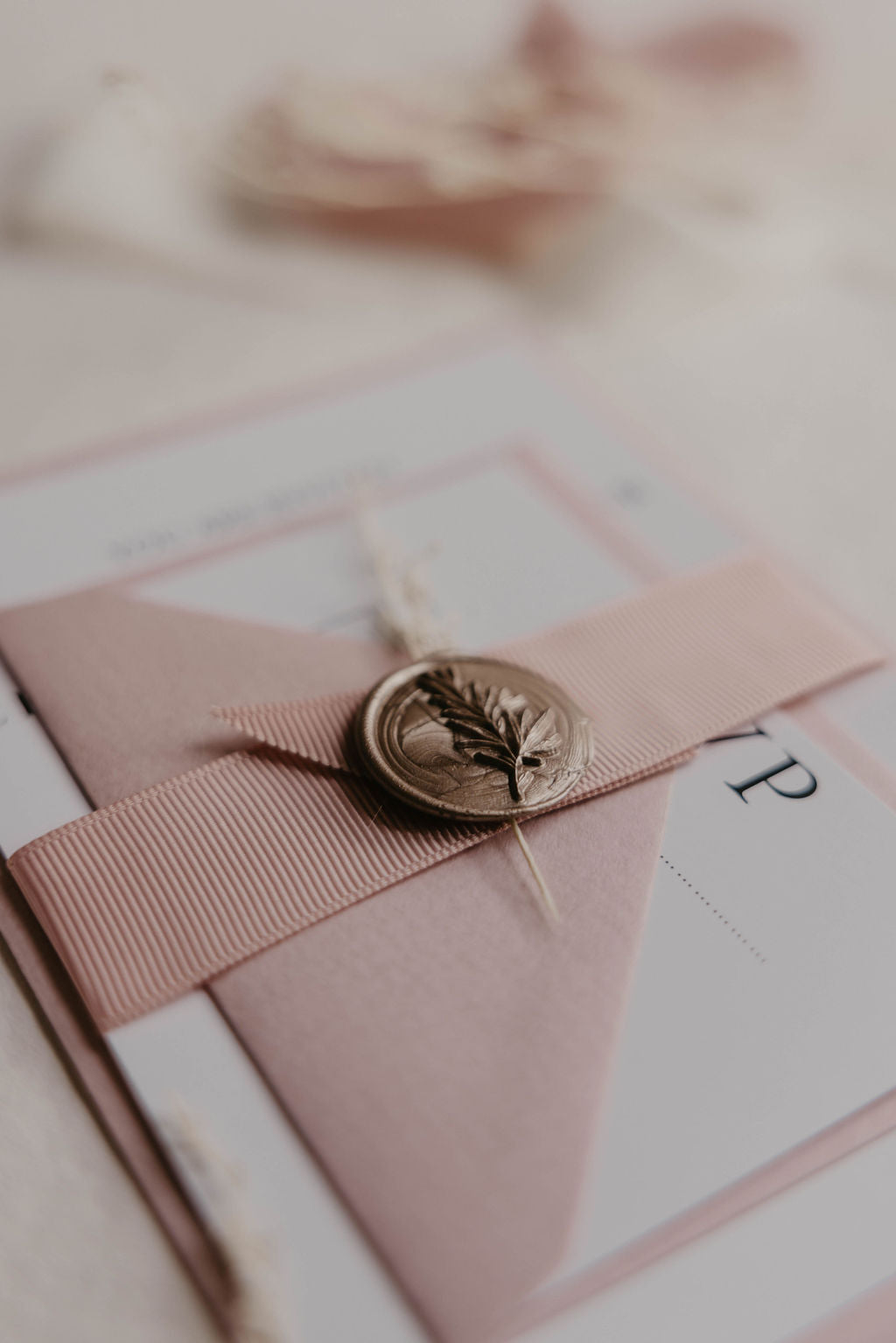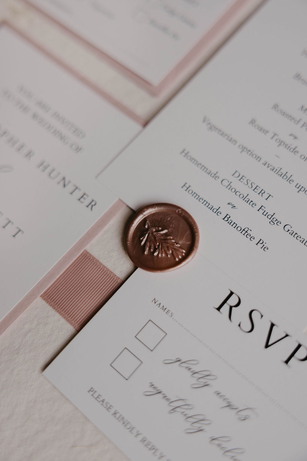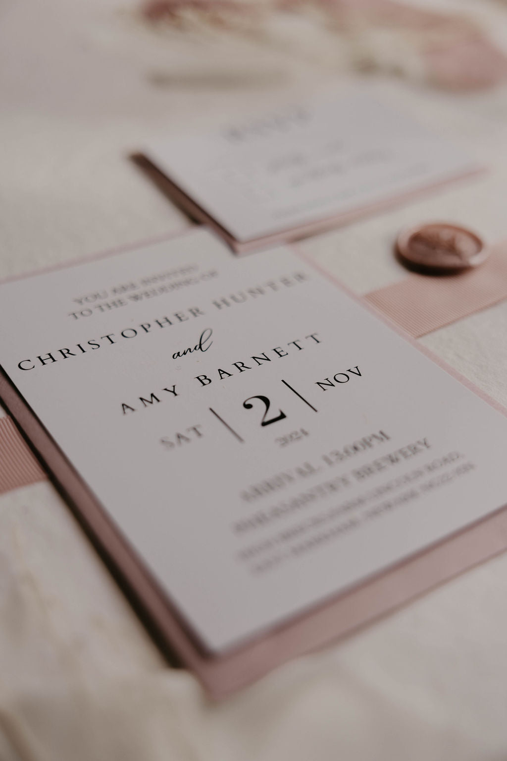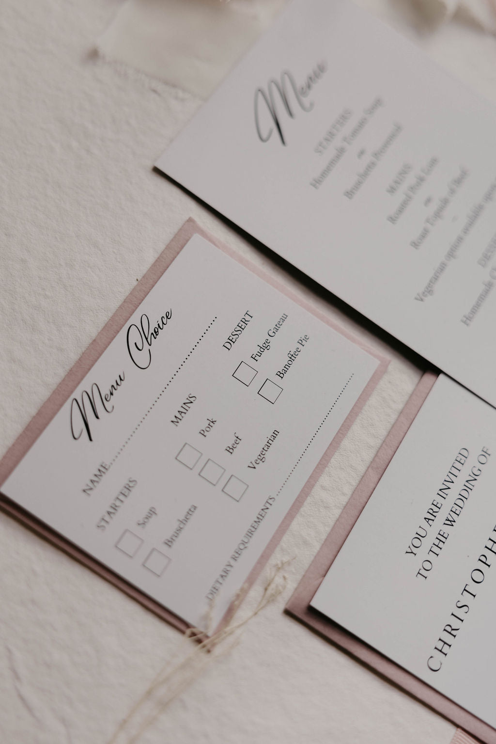 Each invitation is printed on high quality A6 white silk card, finished off with your choice of colour envelope, ribbon, wax seal and dried sprig.